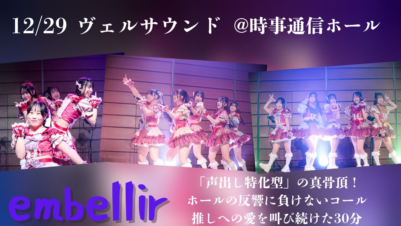 【このブログの目的】 3年間で2,000本以上のライブ動画をアップロードしてきたカメコちょこののが、声出し特化型カメラ映えアイドル『embellir(あんべりー)』への愛と熱量を綴ります。
